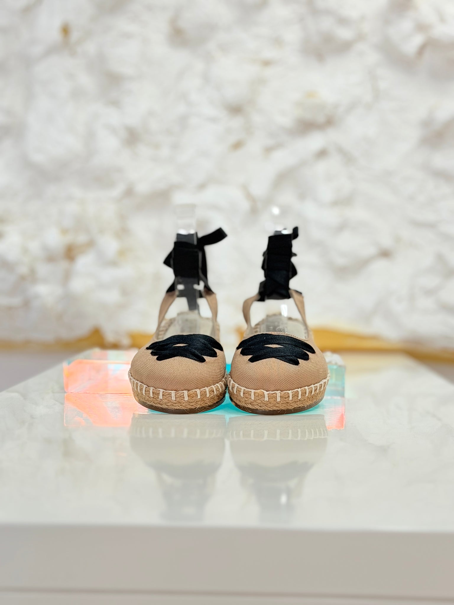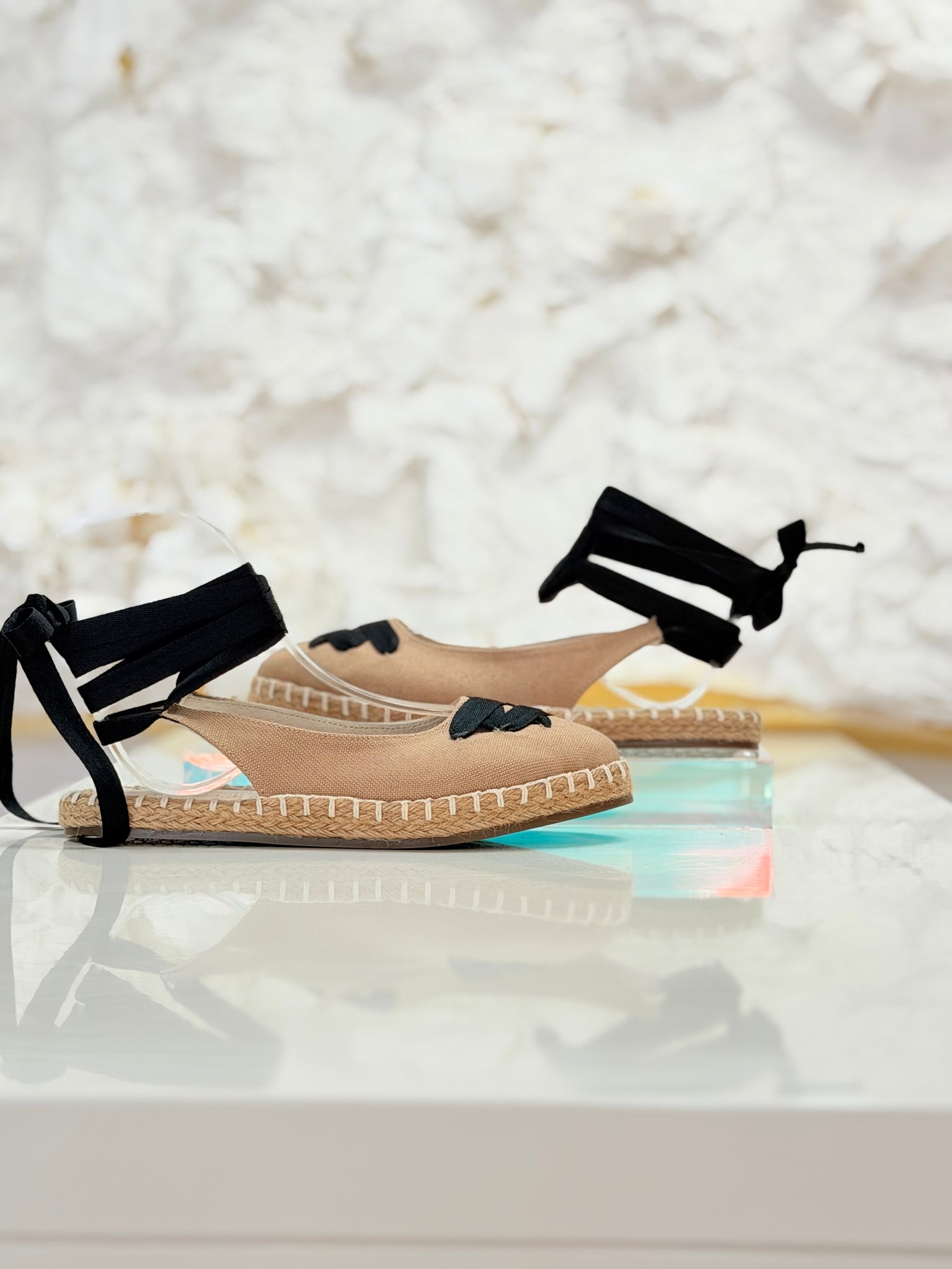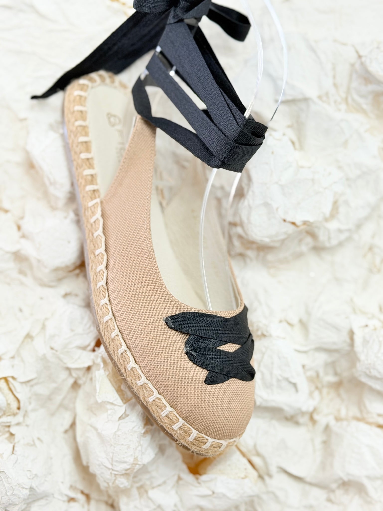 Alpargata en textil con detalle de lazos para amarrar.