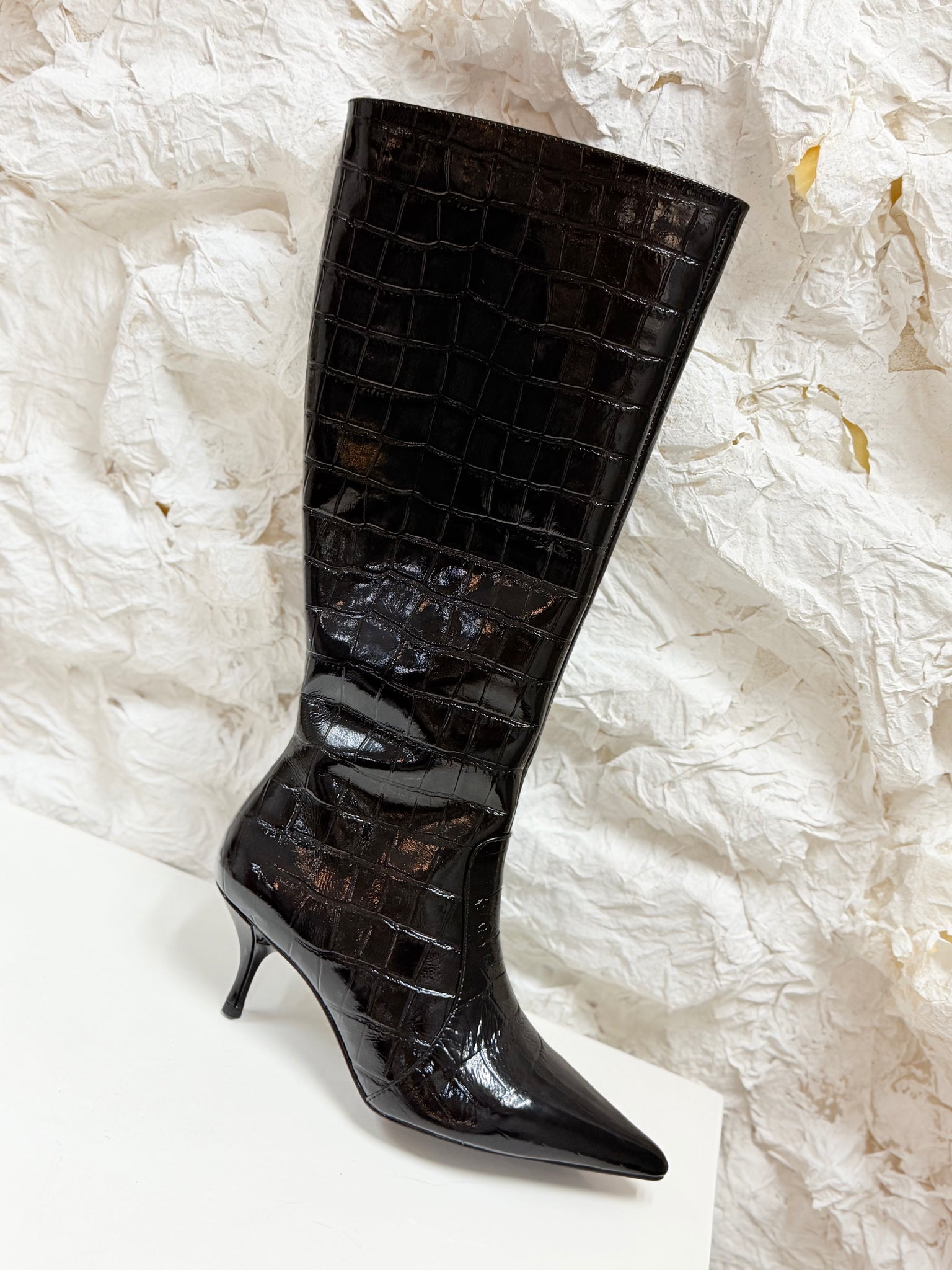 Bota con corte en piel y acabado croco, disponible en dos tonos: Negro y vino